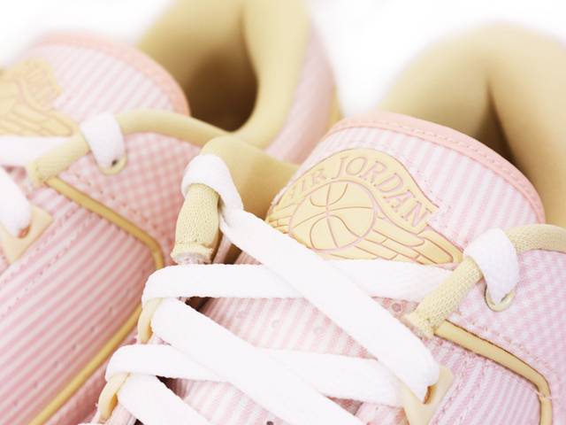 今作はストロベリーのウエハースをイメージしたピンクのアッパーにはシアサッカー素材を採用。