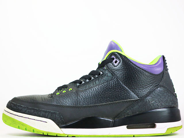 「AIR JORDAN 3」は1988年-1989年シーズンに発売されました。1STカラーのホワイト/グレーセメントが発売されたのが1988年1月です。その翌月のNBA ALLSTAR GAMEの"SLAMDUNK CONTEST"で、JORDANがチャンピオンになった時に着用していたモデルとしても有名です。また、当時の広告にはSPIKE LEE監督を採用し、映画「SHE'S GOTTA HAVE IT」でSPIKE LEE監督自身が演じたジョーダンマニアのキャラ"MARS BLACKMON"が登場するテレビCMは大きな注目を集めました。デザインはティンカー・ハットフィールドです。シリーズ初の踵にビジブルエアを搭載、さらにはJUMPMANロゴの登場、そして現在ではエアジョーダンシリーズでは欠かせなくなったエレファント柄など、エアジョーダンシリーズだけでなくシューズの歴史上重要なモデルです。