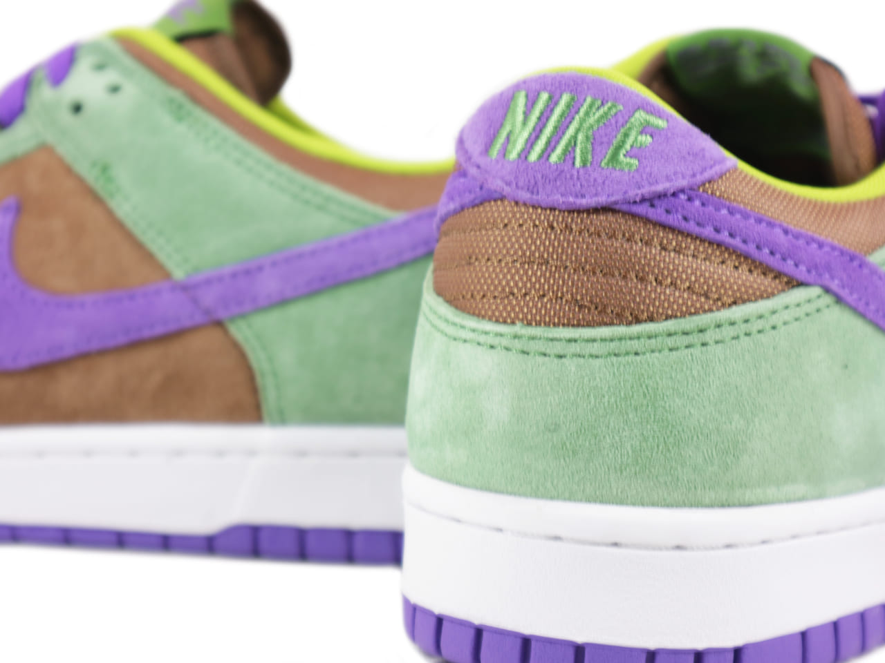 今作は日本企画CO.JPより2001年11月に発売された「DUNK LOW PRO B "VENEER"(624044-251)」の復刻版。高級感のあるスエード素材を使用し、ベニヤ、ディープパープル、オータムグリーンのカラーをまとって復活。オリジナルと同様、メッシュ素材のシュータン、ウーブン素材のシュータンラベルを採用しています。